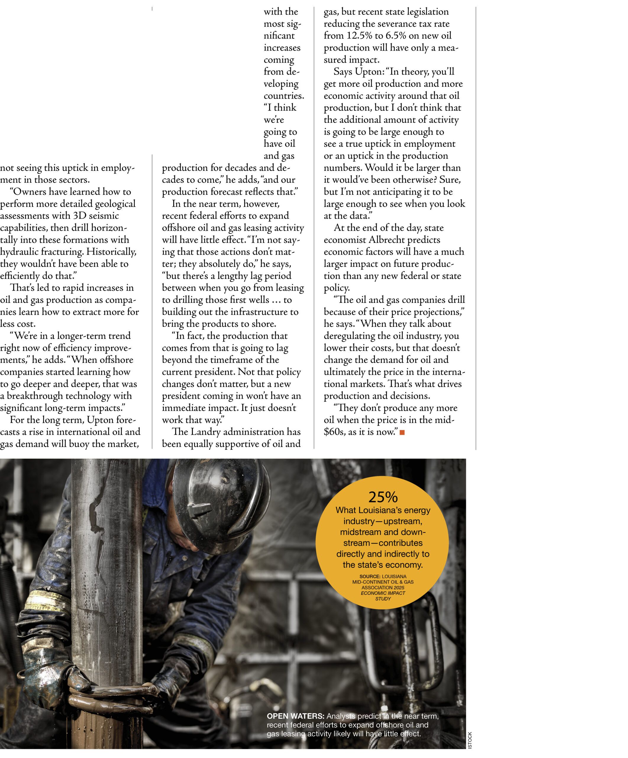In LMOGA’s recent 2025 Economic Impact Study, economist Stephen Barnes found that Louisiana’s energy industry—upstream, midstream and downstream—contributes directly and indirectly to some 25% of the state’s economy.
